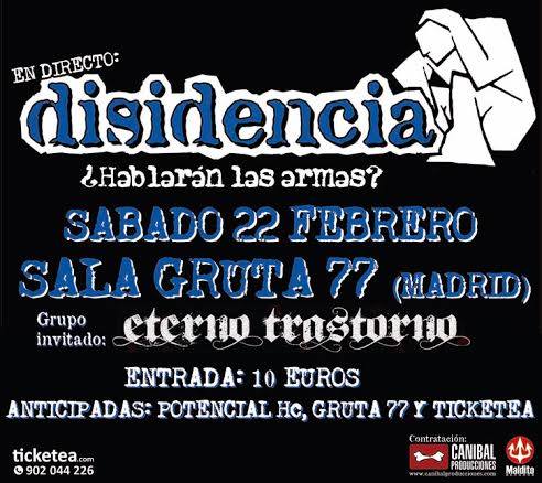 Este sábado Disidencia en la sala Gruta 77 Publicado el febrero 19, 2014 por karabanchel Estándar Este sábado Disidencia Oficial en Gruta77. Entradas en POTENCIAL HARDCORE-PUNK, el propia Gruta 77 y ticketea Comparte esto: Compartir en X (Se abre en una ventana nueva) X Comparte en Facebook (Se abre en una ventana nueva) Facebook Me gusta Cargando... Relacionado