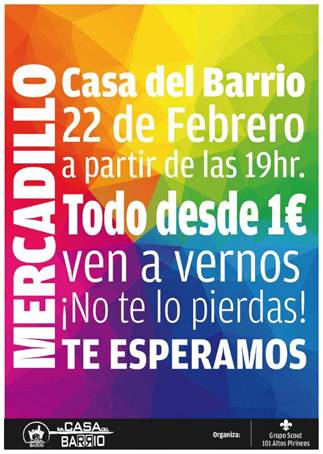 Mercadillo en La Casa del Barrio Publicado el febrero 20, 2014 por karabanchel Estándar El sábado 22 de febrero a partir de las 19 h. Ropa de montaña, libros, discos, dvds y mucho más… desde sólo 1 € Organizado por Grupo Scout Altos Pirineos Comparte esto: Compartir en X (Se abre en una ventana nueva) X Comparte en Facebook (Se abre en una ventana nueva) Facebook Me gusta Cargando... Relacionado