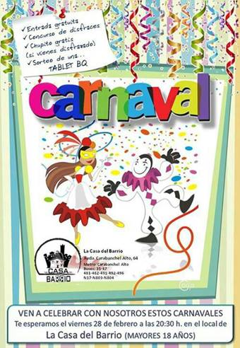 Ven a divertirte a nuestra fiesta de carnaval, con entrada gratuita, concurso de disfraces y el sorteo de una tablet bq. Además si vienes disfrazado te invitamos a un chupito gratis!!!