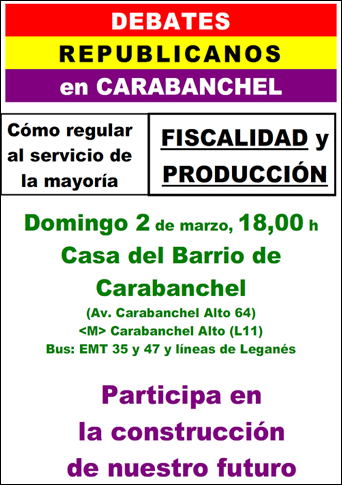Domingo 2 de marzo 18.00 h. Debates Republicanos en Carabanchel: Fiscalidad y producción, cómo regular al servicio de la mayoría.