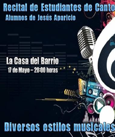 El alumnado de Canto del Profesor y Tenor Jesús Aparicio actuarán con un repertorio de canciones variadas, desde cantantes con repertorio Clásico hasta Moderno.