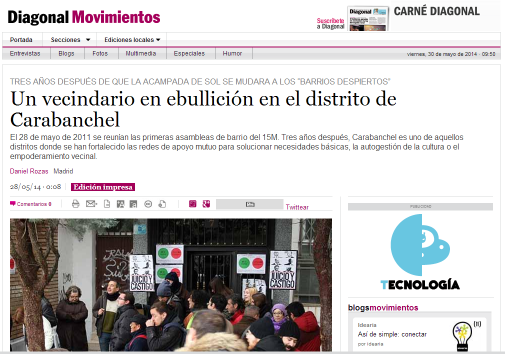 El periódico Diagonal ha publicado el siguiente artículo sobre el barrio de Carabanchel y su «vecindario en ebullición»: