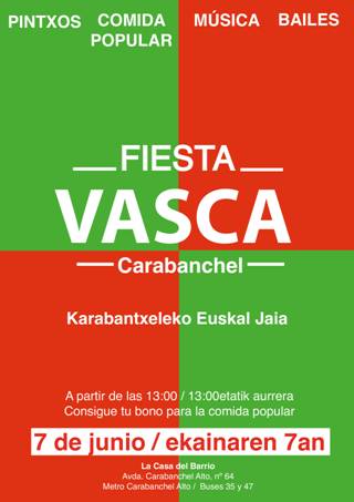 Como empieza a ser costumbre en nuestro barrio y por tercera vez, la Casa del Barrio acoge la Fiesta Vasca (Euskal Jaia). Y esta vez, para no ser menos, volveremos a preparar el próximo sábado 7 de junio una gran comida popular organizada junto a miembros del grupo de facebook «Euskaldunes por los Madriles» y en twitter @EuskoMadrilgoak