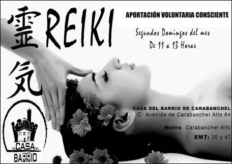 Tras acabar el curso de Terapeuta de Reiki, celebrado en La Casa del Barrio, las alumnas y alumnos que participaron en él, ofrecen sesiones de Reiki todos los segundos domingos de mes, de 11 a 13 h, por la aportación voluntaria consciente que cada persona estime.