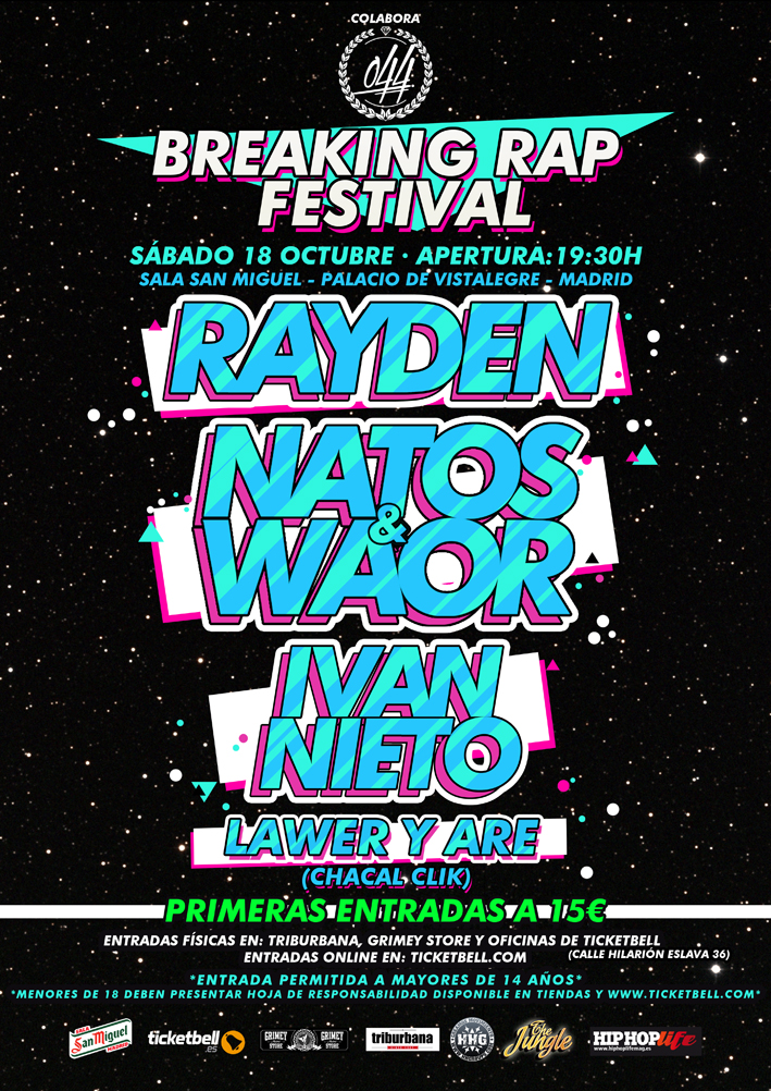 El próximo sábado 18 de Octubre tendrá lugar la primera edición del Breaking rap festival. Un evento que reúne a potentes artistas de la cultura Hip Hop de nuestro país en la Sala San Miguel del Palacio de Vistalegre de Madrid. Al evento podrán acceder menores de edad desde 14 años y hasta la fecha están confirmados los siguiente artistas: Rayden, Natos & Waor, Iván Nieto y Lawer y Are (Chacal clik). Las entradas se pueden adquirir tanto en puntos de venta físicos (Triburbana, Grimey Store y las oficinas de Ticketbell) como por Internet en ticketbell.es al precio de 15 Euros + gastos de distribución. En total más de 4 horas de rap, buen rollo y muchas sorpresas, no te quedes sin tu entrada!