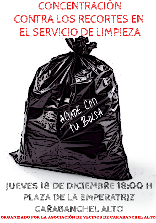 Hoy concentración contra los recortes en el servicio de limpieza en Carabanchel Alto Publicado el diciembre 18, 2014 por karabanchel Estándar Hoy a la 18,00 h en la Plaza de la Emperatriz de Carabanchel Alto tendrá lugar una concentración en contra de los recortes de los servicios de limpieza. Comparte esto: Compartir en X (Se abre en una ventana nueva) X Comparte en Facebook (Se abre en una ventana nueva) Facebook Me gusta Cargando... Relacionado