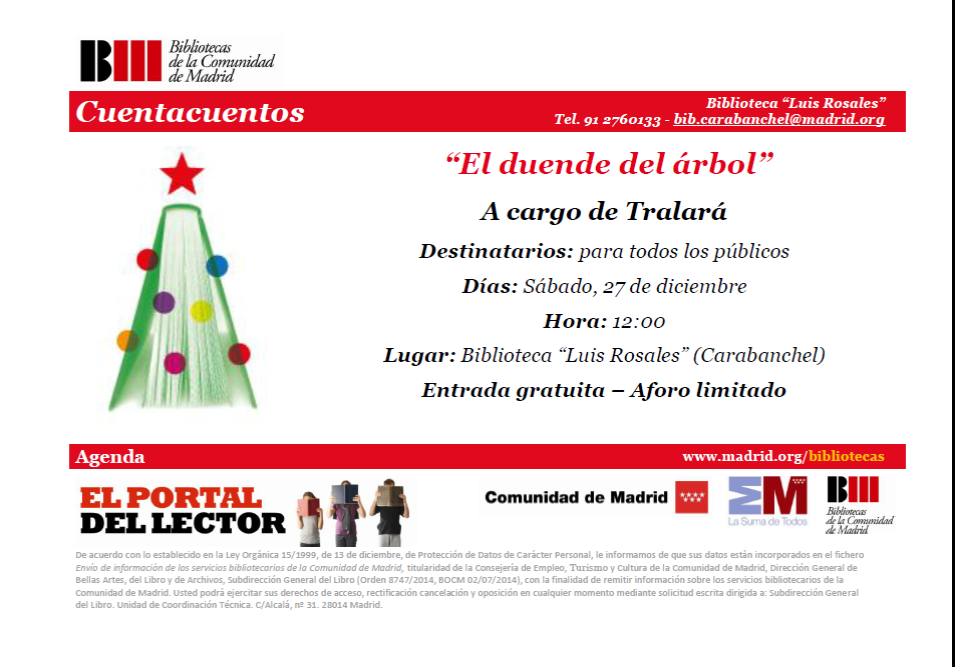 Cuentacuentos en la biblioteca Luis Rosales en 27 de diciembre Publicado el diciembre 22, 2014 por karabanchel Estándar Cuentacuentos «El duende del árbol» a cargo de Tralará en la biblioteca Luis Rosales en 27 de diciembre a las 12 h. Para todos los públicos, con entrad gratuita y aforo limitado. Comparte esto: Compartir en X (Se abre en una ventana nueva) X Comparte en Facebook (Se abre en una ventana nueva) Facebook Me gusta Cargando... Relacionado