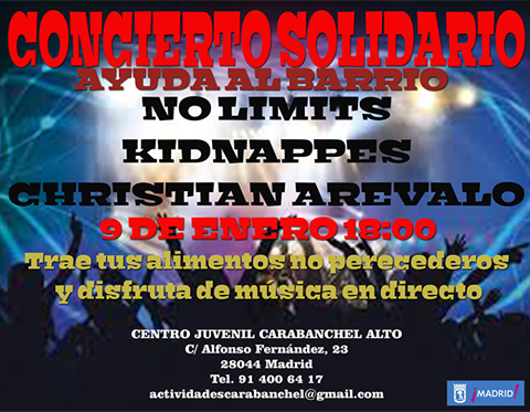 Concierto Solidario: Ayuda al barrio hoy viernes 9 de enero de 18:00 a 20:00 en el centro juvenil Carabanchel Alto (C/Alfonso Fernández 23).