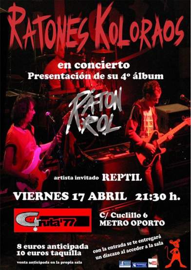 Hoy viernes 17 de abril a las 21,30 h en el Gruta 77 actúan Ratones Koloraos. Con sonidos de ska y rock and roll, con letras mordaces y llenas de denuncia social y con un montón de K en sus textos se confirma la madurez y solidez de una banda que debiera afianzarse como una de las más divertidas del Estado: Ratones Koloraos.