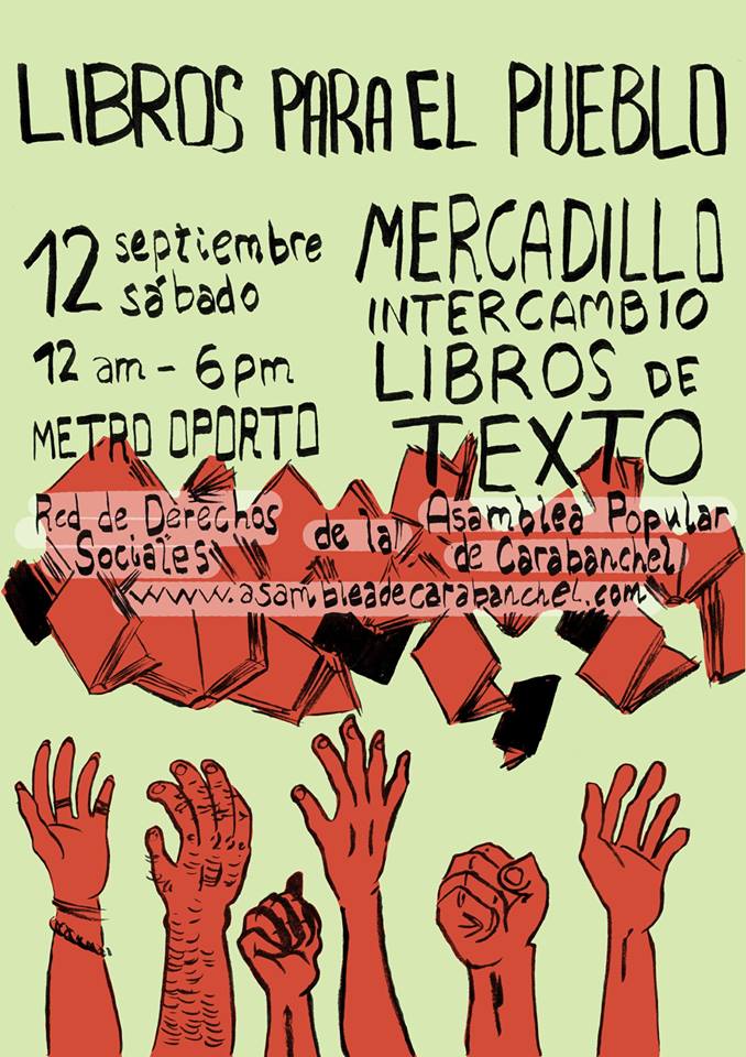 El próximo sábado 12 de septiembre de 12h a 18h la Red de Derechos Sociales de la Asamblea de Carabanchel organiza un mercadillo de intercambio de libros de texto en la plaza de Oporto.