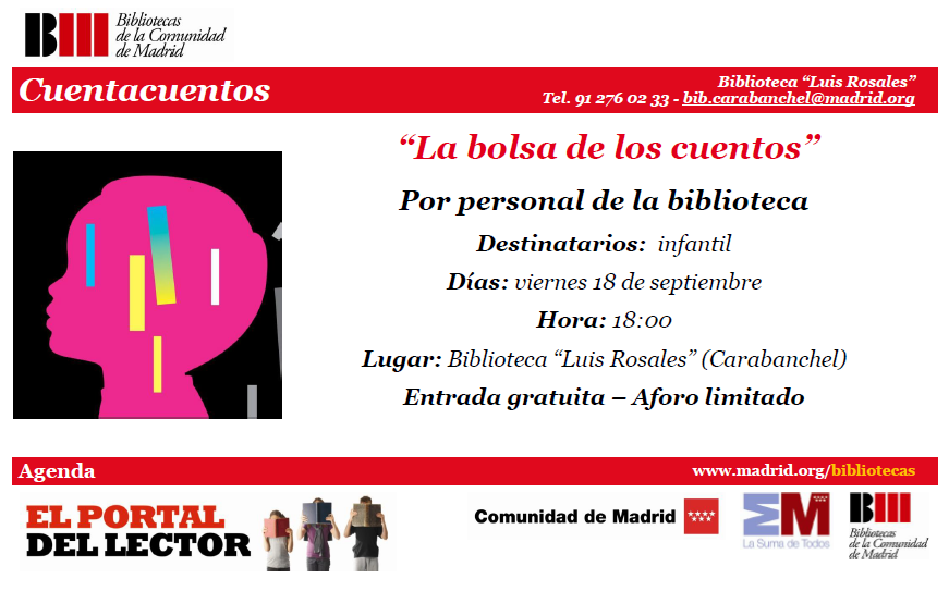 Cuentacuentos en la biblioteca Luis Rosales el 18 de septiembre Publicado el septiembre 14, 2015 por karabanchel Estándar El viernes 18 de septiembre a las 18 h en la biblioteca Luis Rosales se celebrará el cuentacuentos infantil «La bolsa de los cuentos» organizado por el el personal de la biblioteca. La entrada es gratuita, pero el aforo es limitado. Comparte esto: Compartir en X (Se abre en una ventana nueva) X Comparte en Facebook (Se abre en una ventana nueva) Facebook Me gusta Cargando... Relacionado