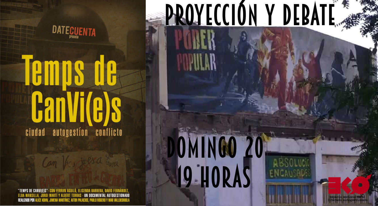 El próximo domingo 20 de septiembre a las 19 horas se proyectará el documental Temps de CanVi(e)s en el EKO (C/ Ánade 9). Tras la proyección del mismo habrá la oportunidad de comentarlo con varias personas que han participado en la realización del documental autogestionado.