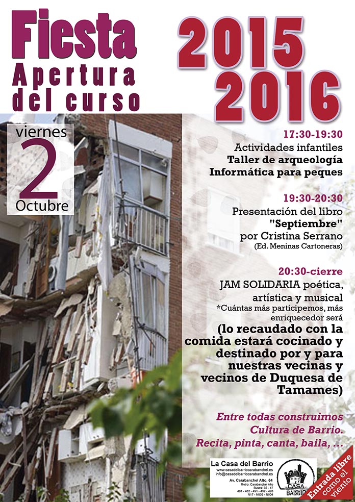 El viernes 2 de octubre La Casa del Barrio (Avda. de Carabanchel Alto 64) comienza un nuevo curso. La apertura del curso será una fiesta cuyos beneficios se destinarán a los afectados por el derrumbe del edificio de la calle Duquesa de Tamames.