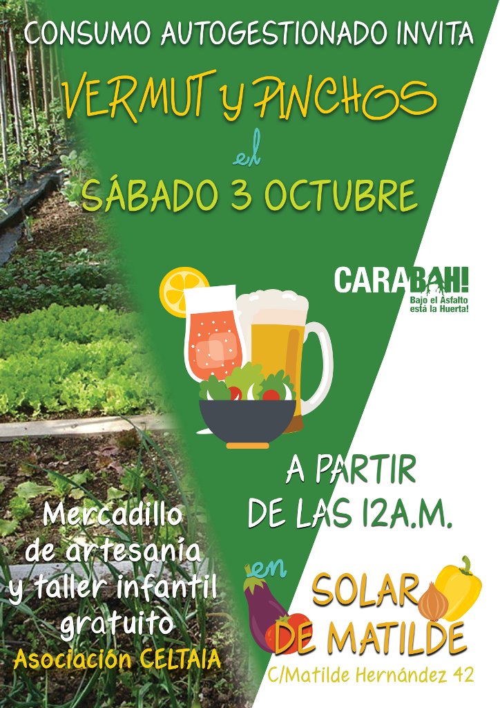 El grupo de consumo CaraBAH ha preparado para el sábado 3 de octubre a las 12 h un vermut con pinchos para celebrar el otoño y, de paso, recaudar algo de pasta. Tendrán música, cervecicas, vermú y tapas vegetarianas. En el Solar de Matilde, espacio liberado para el disfrute y el cultivo de hortalizas, en C/Matilde Hernández 42. Al principio de la jornada habrá un taller infantil de reciclaje a cargo de la asociación CELTAIA.