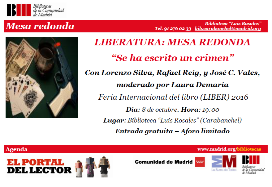 El jueves 8 de octubre a las 19 h con motivo de la Feria Internacional del Libro 2016 se llevará a cabo la Mesa Redonda «Se ha escrito un crimen» en la biblioteca Luis Rosales con la presencia de Lorenzo Silva, Rafael Reig y José C. Vales.