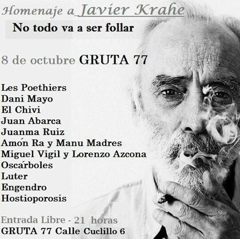 El jueves 8 de octubre se celebrará un homenaje a Javier Krahe en la Gruta 77 (C/ Cuclillo 6) con la participación de Les Poethiers, Dani Mayo, El Chivi, Juan Abarca, etc. La entrada es libre.
