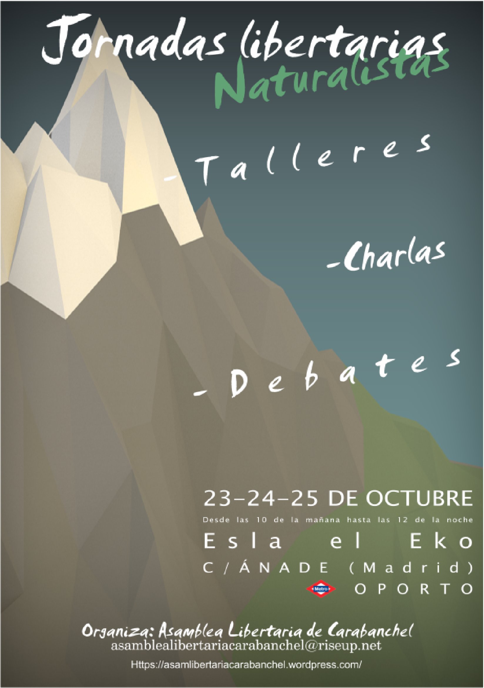 Esta es la programación de las I Jornadas Naturalistas Libertarias organizadas por la Asamblea Libertaria de Carabanchel y que van a tener lugar a partir de hoy en el EKO (C/ Ánade 9):