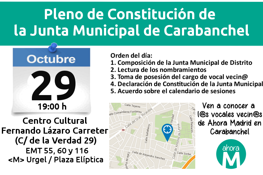 El jueves 29 de octubre a las 19 h tendrá lugar el Pleno de Constitución de la Junta Municipal de Carabanchel en el Centro Cultural Fernando Lázaro Carreter (C/ la Verdad 29). El orden del día es el siguiente: