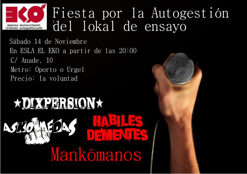El próximo sábado 14 de noviembre a partir de las 20 h se celebra una fiesta por la autogestión del local de ensayo del EKO. Así nos lo cuentan los grupos: