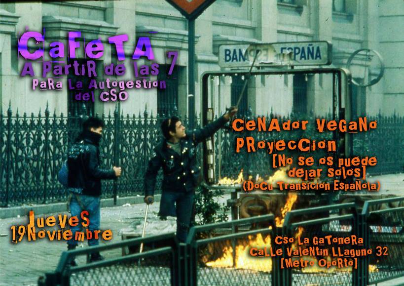 El jueves 19 de noviembre a partir de las 19 h tendrá lugar una «Cafeta» en la CSO La Gatonera (C/ Valentín Llaguno 32) con cenador vegano y la proyección del documental «No se os puede dejar solos» sobre la Transición Española.
