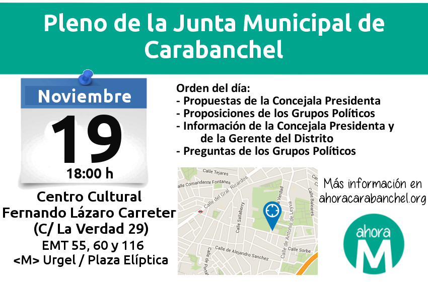 Hoy 19 de noviembre a las 18 h se celebra el próximo Pleno de la Junta Municipal de Carabanchel en el salón de actos del Centro Cultural Lázaro Carreter (C/ La Verdad 29).