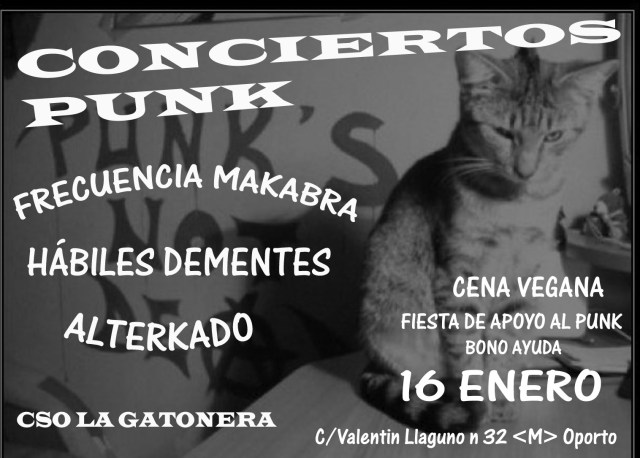 El sábado 16 de enero actuarán en La Gatonera los grupos Frecuencia Makabra, Hábiles Dementes y Alterkado en una «fiesta en apoyo al punk» con cena vegana.