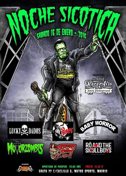 Mañana 16 de enero tendrá lugar el festival de Psychobilly «Noche Sicótica» en el Gruta 77 con la actuación de las bandas 13 Bats, Lucky Daddos, Baby Horror, Motorzomis, Screamers and Sinners y Ro & The School Boys. Así lo cuenta el organizador del festival: