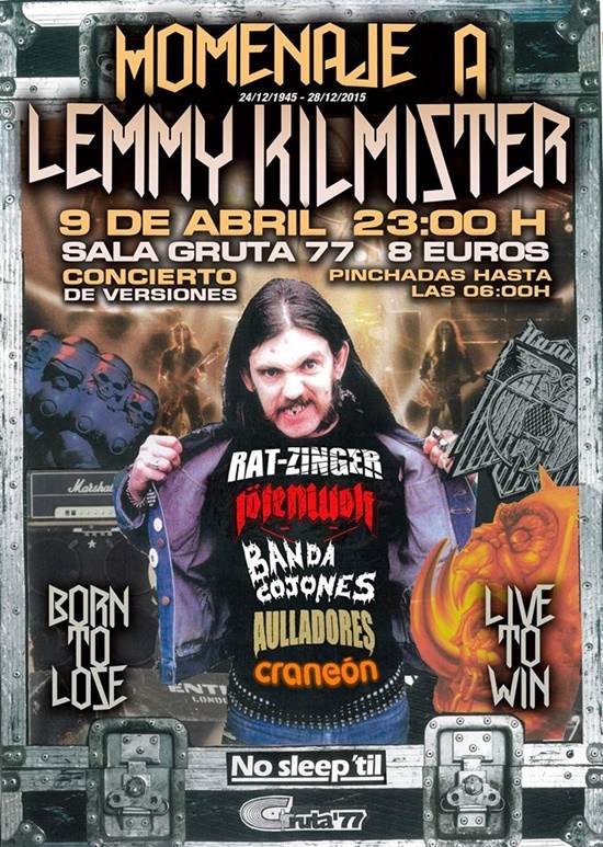 El sábado 9 de Abril en la Gruta 77 tendrá lugar un concierto homenaje a la figura de Lemmy Kilmister (Motorhead) con la presencia Aulladores, Tötenwolf,Banda Cojones, Rat-Zinger y Craneón.
