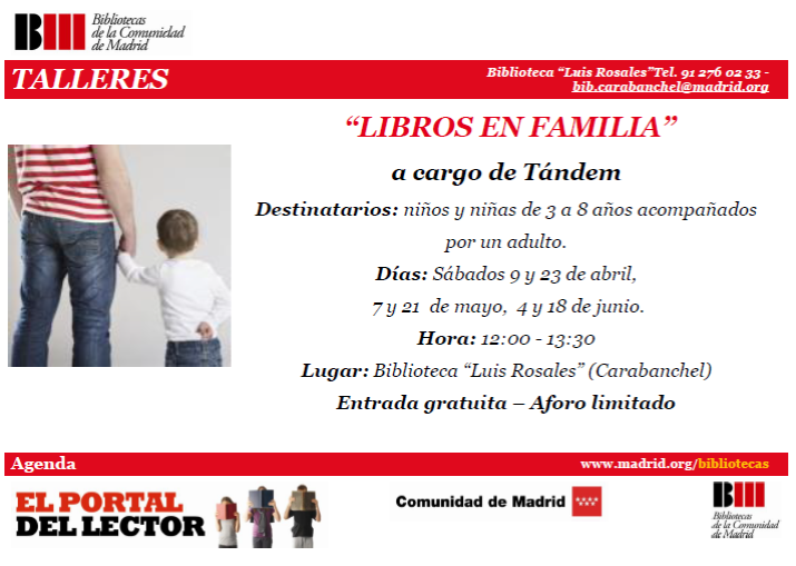 Taller «Libros en familia» en la biblioteca Luis Rosales Publicado el abril 8, 2016 por karabanchel Estándar Los sábados 9 y 23 de abril, 7 y 21 de mayo, 4 y 18 de junio tendrá lugar el taller «Libros en familia» en la biblioteca Luis Rosales destinado a niños y niñas de 3 a 8 años. La entrada es gratuita y el aforo es limitado. Comparte esto: Compartir en X (Se abre en una ventana nueva) X Comparte en Facebook (Se abre en una ventana nueva) Facebook Me gusta Cargando... Relacionado