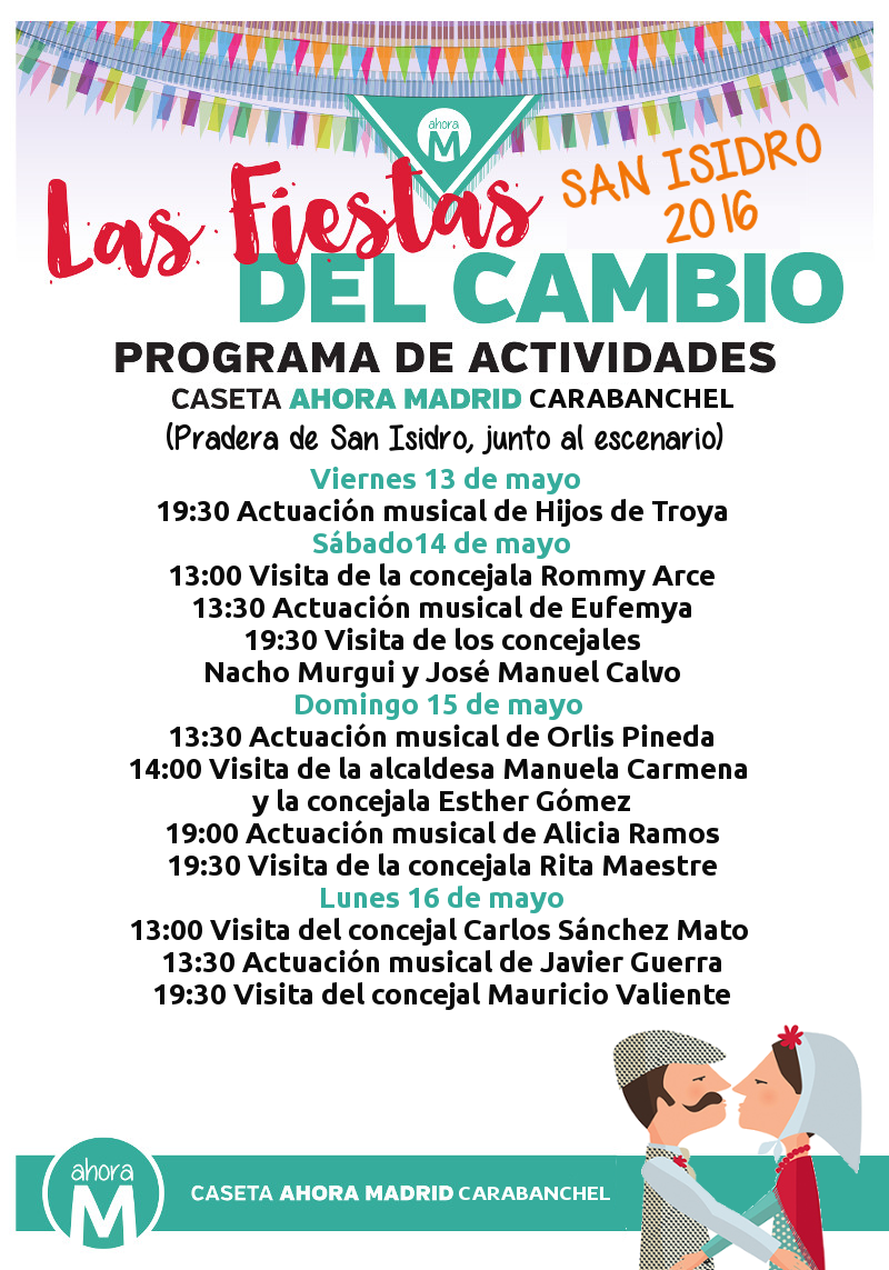Programación de la caseta de Ahora Madrid Carabanchel en las fiestas de San Isidro Publicado el mayo 12, 2016 por karabanchel Estándar Esta es la programación de la caseta de Ahora Madrid Carabanchel en las fiestas de San Isidro, situada junto al escenario de la Pradera: Comparte esto: Compartir en X (Se abre en una ventana nueva) X Comparte en Facebook (Se abre en una ventana nueva) Facebook Me gusta Cargando... Relacionado