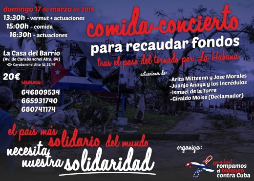 Comida-concierto para recaudar fondos tras el paso del tornado por La Habana. Con actuaciones de Arita Mitteenn y José Morales, Juanjo Anaya y los Incrédulos, Ismael de la Torre, Giraldo Moise (declamador). Reservas en los teléfonos: 646809534-665931740-680741174.
