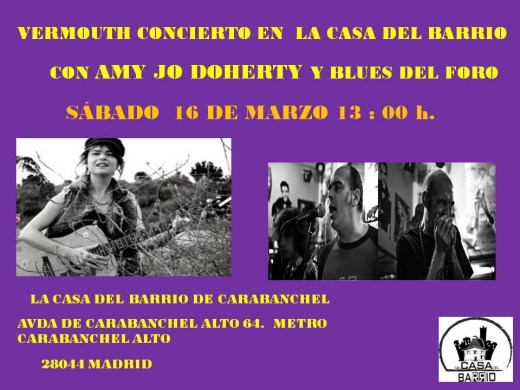 Amy jo Doherty nos ofrecerá una dosis de energía y buenas canciones , mezclando su repertorio con versiones de clásicos del rock, folk etc.los conciertos de Amy suelen ser una fiesta ,así qué preparaos a cantar y bailar sin parar. Anteriormente Blues del Foro harán de teloneros tocando Blues en Castellano y otras perlas del cancionero popular. Letras con ironía y humor para mentes pensantes. Un buén plan para un Sábado de Vermouth que no os deberíais perder.