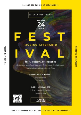 Festival músico-literario con micro abierto para aquel que quiera compartir cualquier creación artística. Se comenzará con las presentaciones del libro de una novela-ensayo filosófica con Sheila Gómez y de otra de ficción con Luis Celaá. Luego ellos mismos mostrarán su parte más poética para dar paso a Enfermo Aka The Panter y The Niño Sarri. Música y rap no pueden faltar en un evento en el que se invita a la reflexión de la sociedad y del mundo en el que vivimos a través de una crítica social. Ven a pensar, debatir, cantar, bailar, rimar, beber, pero sobre todo a divertirte SIEMPRE desde el respeto de ser uno mismo.
