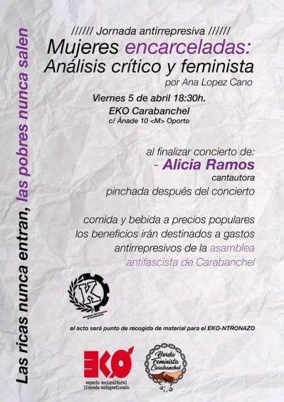 Habrá bebida y papeo a precio libre, y después de la charla/debate concierto de Alicia Ramos. Los beneficios obtenidos irán para sufragar gastos judiciales de la Asamblea Antifascista de Carabanchel.