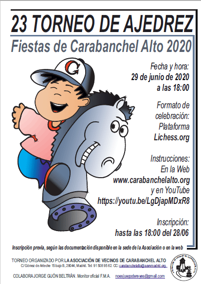 Es necesaria la inscripción previa enviando un correo a torneoajedrezcarabanchelalto@yahoo.esantes del 28 de junio a las 18 h. Más información en carabanchelalto.org