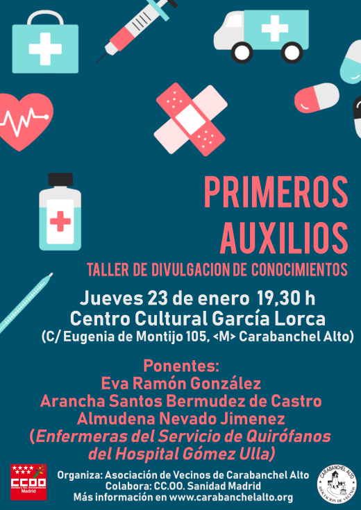 El próximo jueves 23 de enero a las 19,30 h tendrá lugar un taller de divulgación de conocimientos sobre Primeros Auxilios en el Centro Cultural García Lorca (C/ Eugenia de Montijo 105, <M> Carabanchel Alto, EMT 34, 35 y 139).