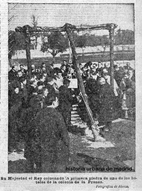 Fotografía de Alfonso XIII colocando la primera piedra de la Colonia de la Prensa en el Heraldo de Madrid