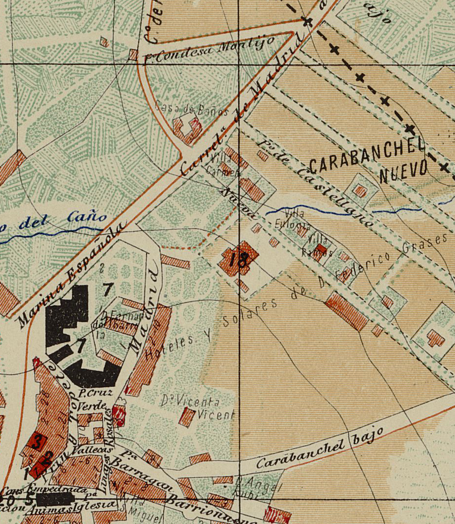 En el plano de Facundo Cañada de 1900 se observa que ya se había abierto varias de las calles del barrio «Carabanchel Nuevo», epígrafe bajo que el que aparecía escrito Hoteles y Solares de D. Federico Grases. Se observan también los primeros hoteles, alrededor de diez, que tomaron los nombres de Villa Carmen, Villa Eulogia, etc. Hasta unas décadas después no se construiría el resto de la colonia.