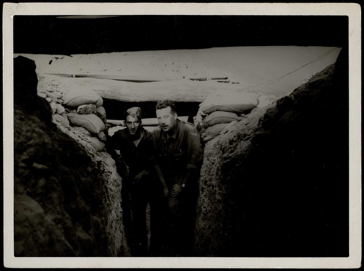 Edgar Neville posa con un falangista en el interior de una trinchera. En esta época (finales de 1937) Neville trabaja como reportero para los medios de falange, a las órdenes de Manuel Pio Halcón, con la redacción e imprenta en Donostia. Tengo mis dudas sobre su está foto y otra más pertenecen al frente de Carabanchel o al frente de Huesca, también visitado por el señor Neville en la misma época.