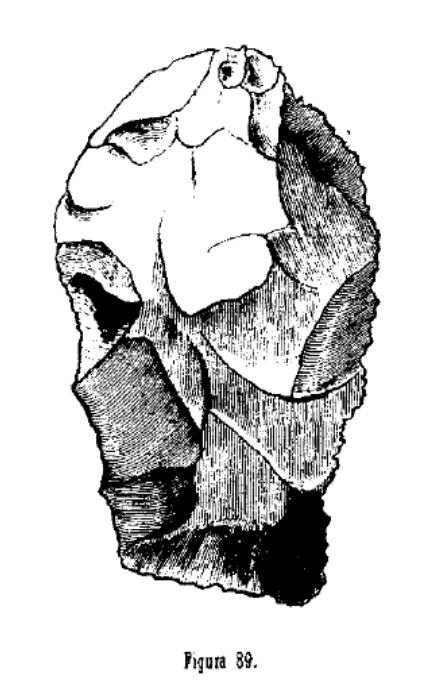 Hacha de sílex entregada por el obrero a Lartet dibujada por Casiano de Prado y reproducida en su obra Descripción física y geológica de la provincia de Madrid
