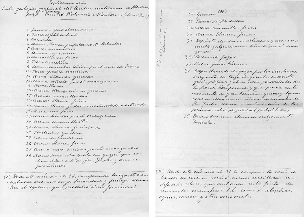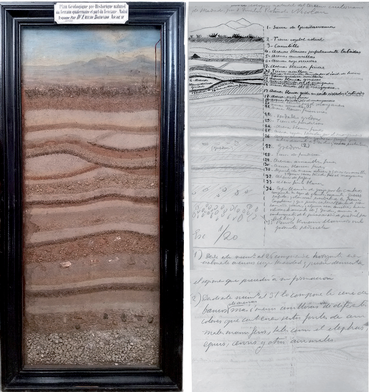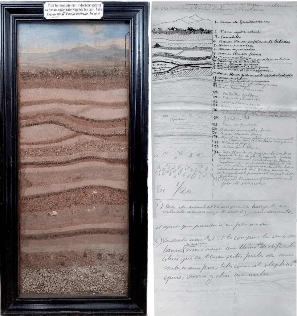 Manuscritos, grabados y tablero del corte estratigráfico del yacimiento de San Isidro por Emilio Rotondo (década de 1920)