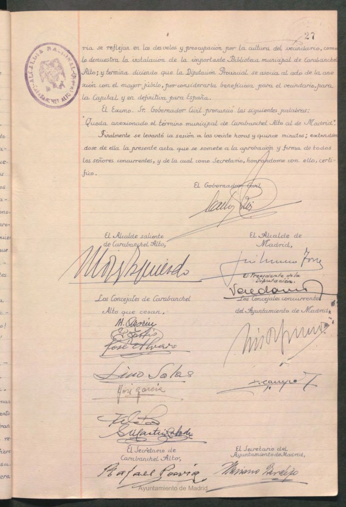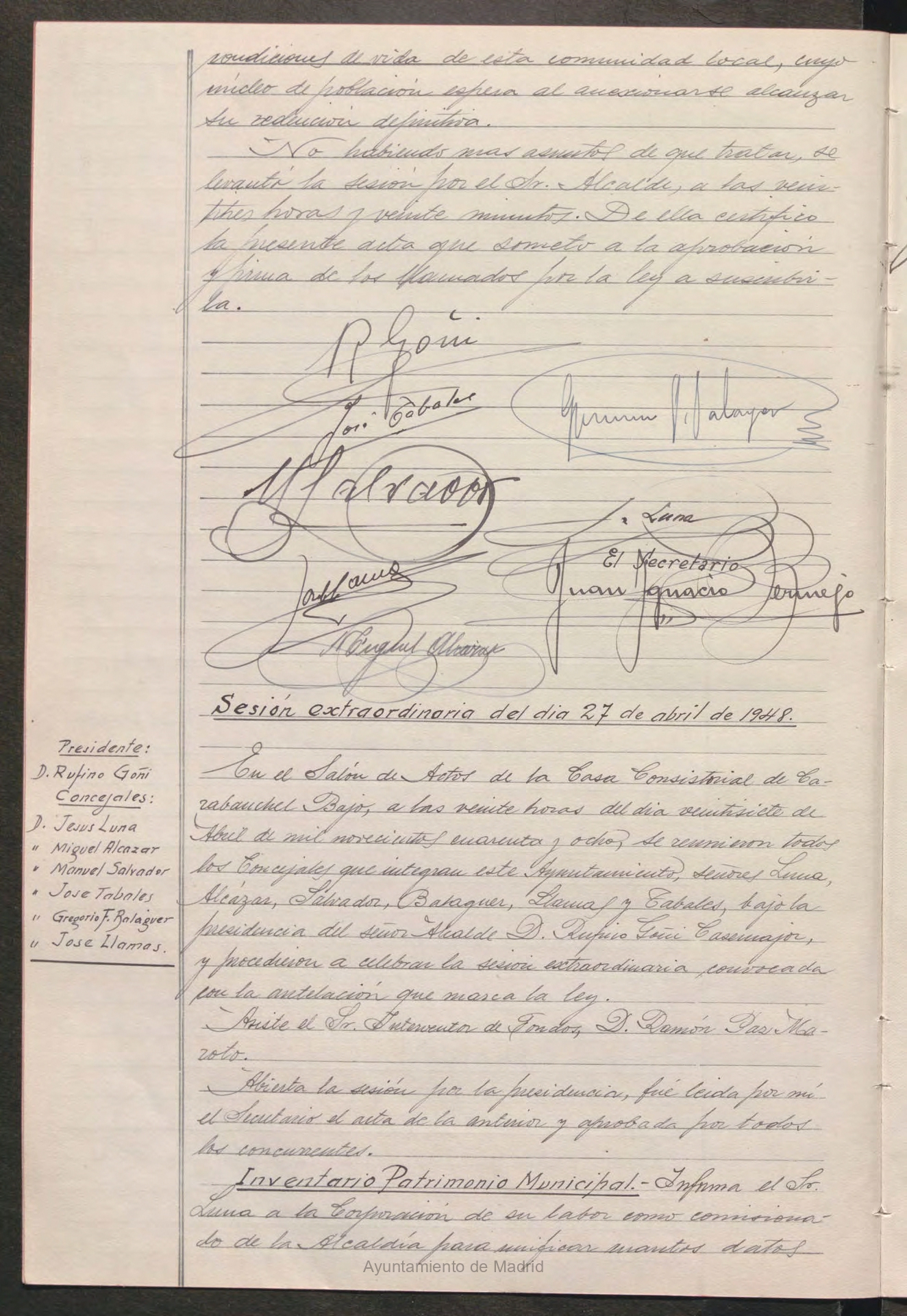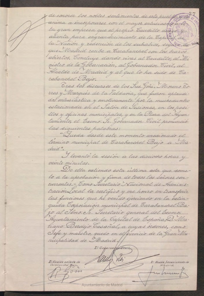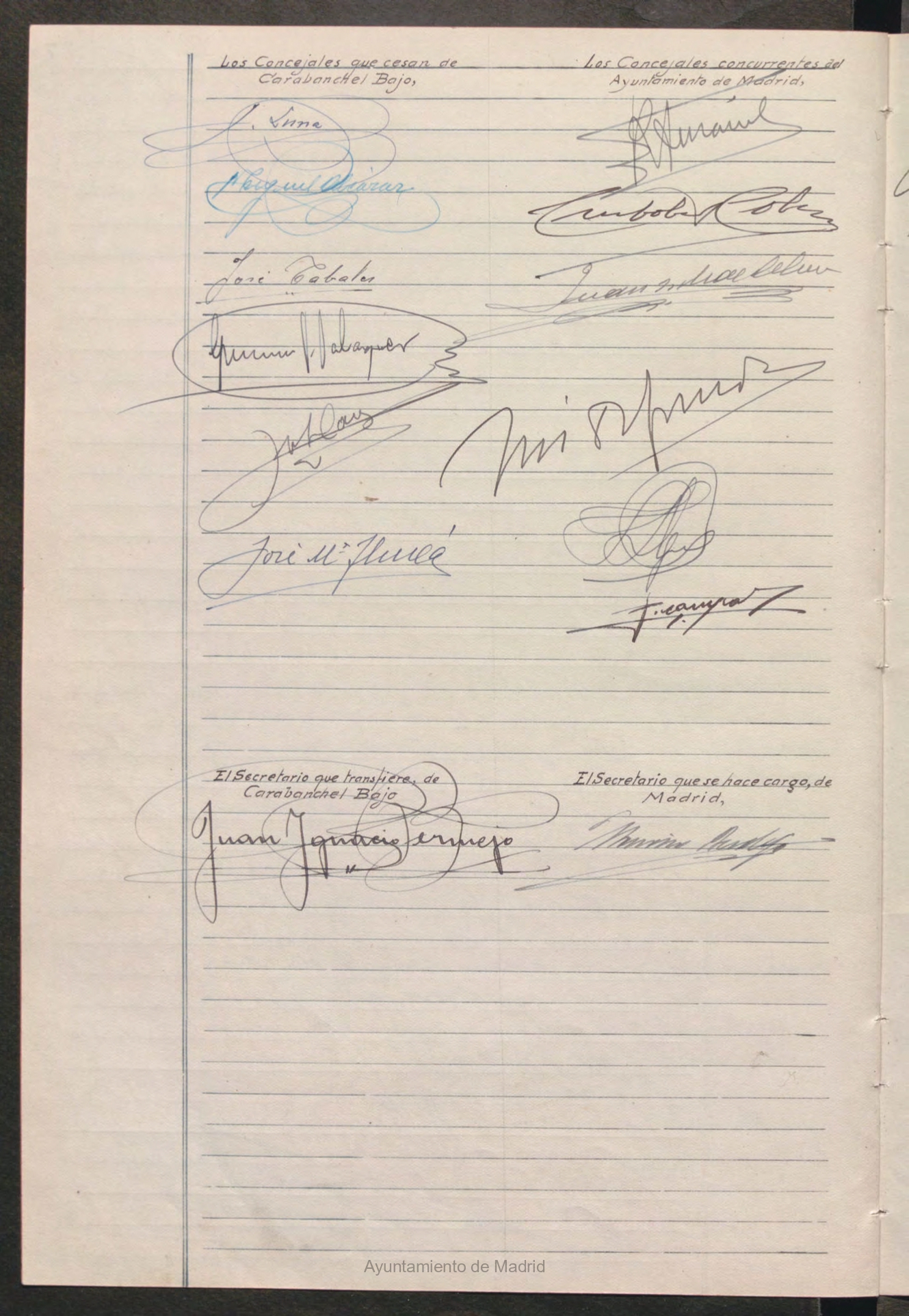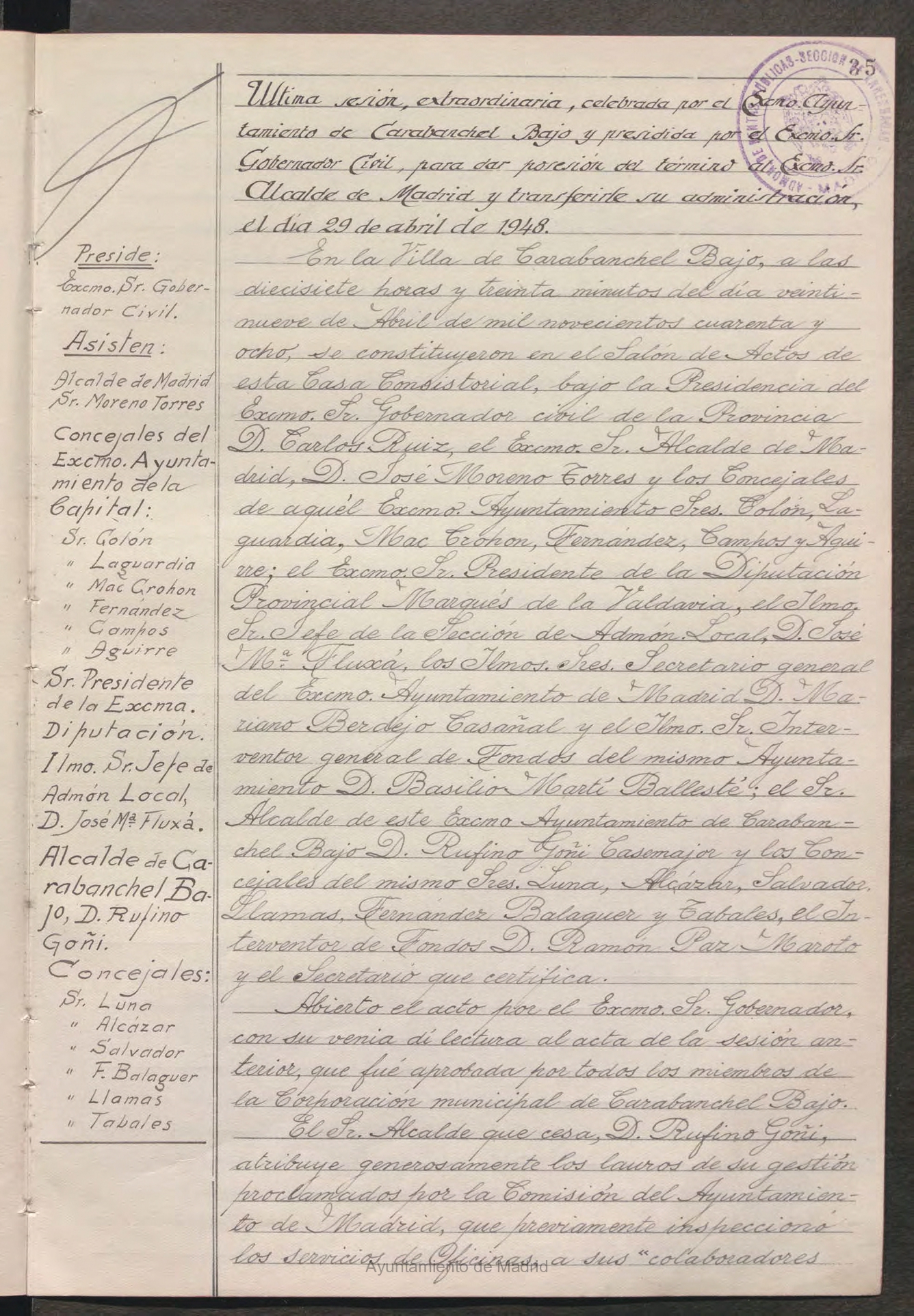 Información sobre la anexión de Carabanchel Bajo a Madrid en el acta de la sesiones plenarias del Ayuntamiento de Carabanchel Bajo del 10 y el 27 de abril de 1948