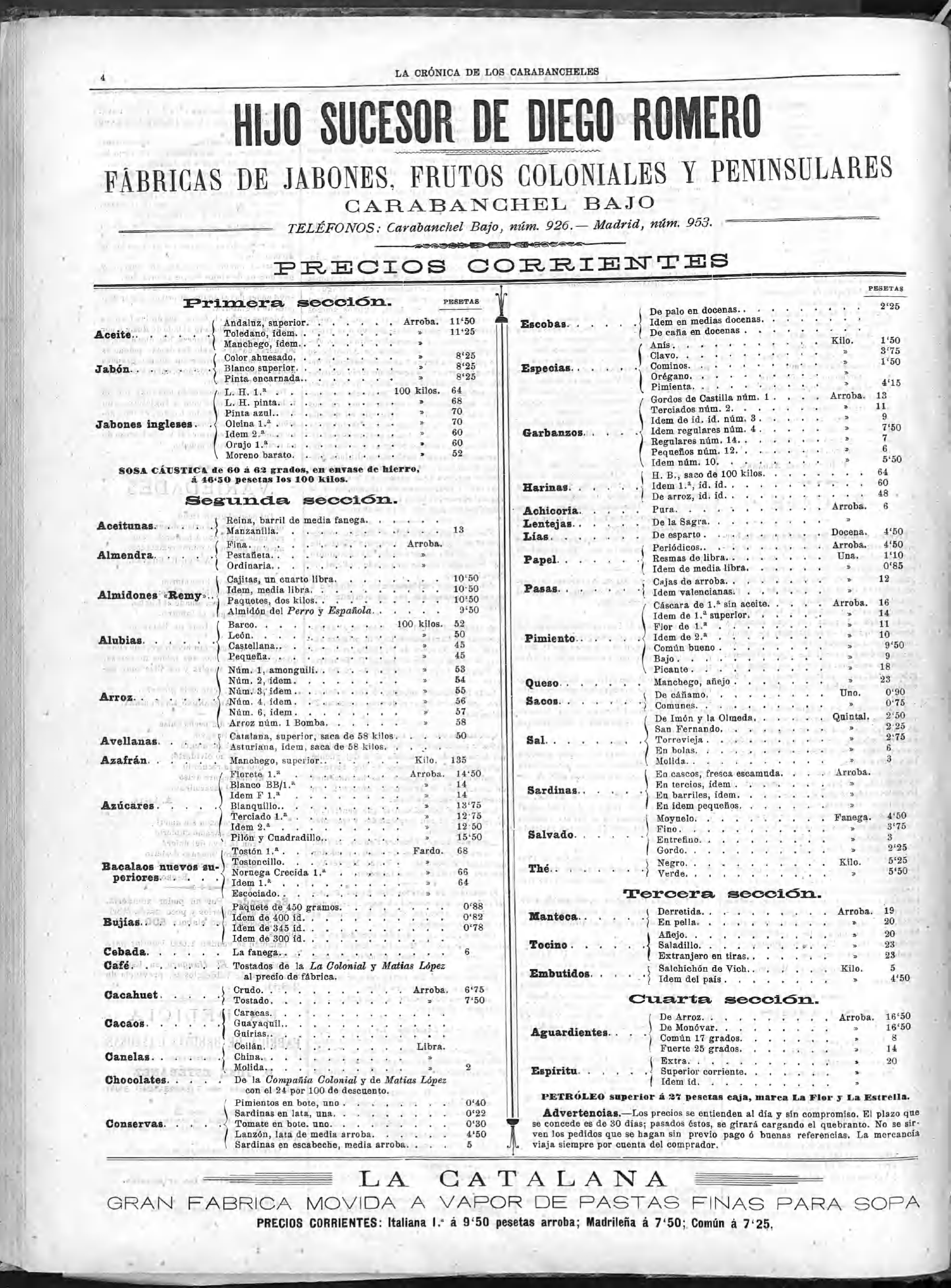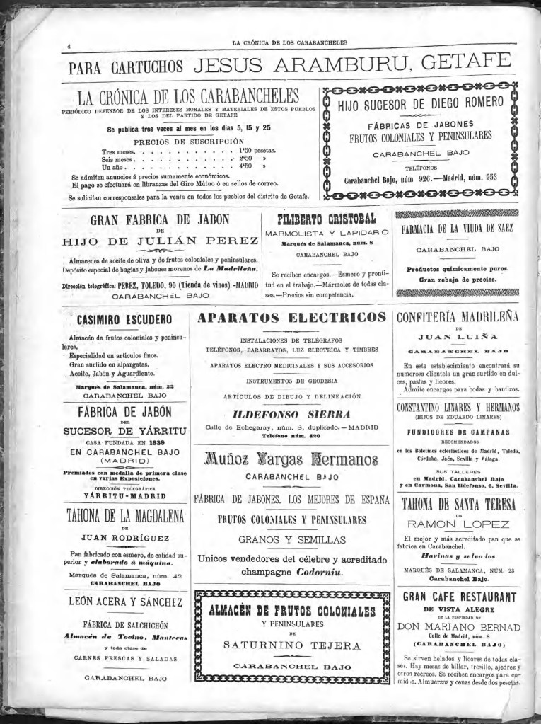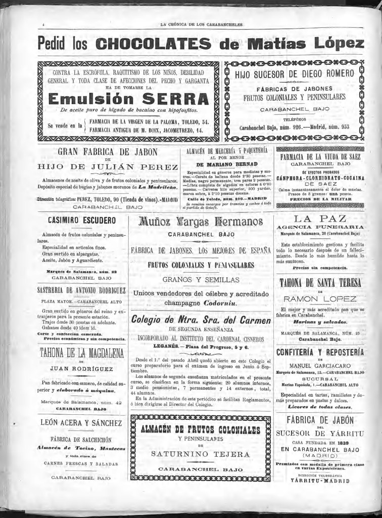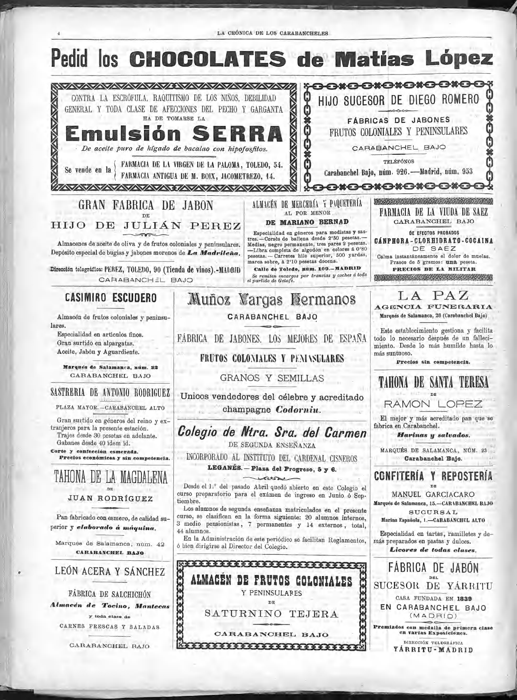 Anuncios comerciales en el periódico La Crónica de los Carabancheles (1897-1898)Entrada a los almacenes Diego Romero e hijos (finales de 1990)Anuncio de la fábrica de jabón de Diego Romero e HijosCartel de la Gran fábrica de jabón de Hijo de J. PérezAnuncios de fábricas de jabón de Carabanchel BajoTrabajadoras de la fábrica de cerillas La Fosforera