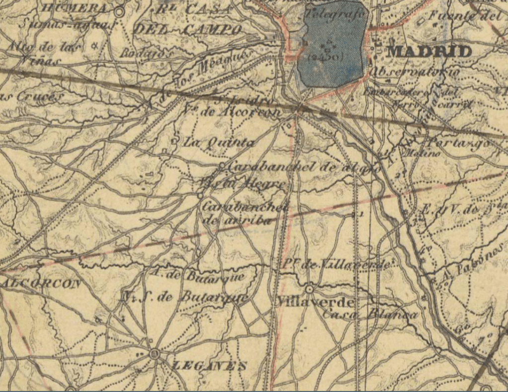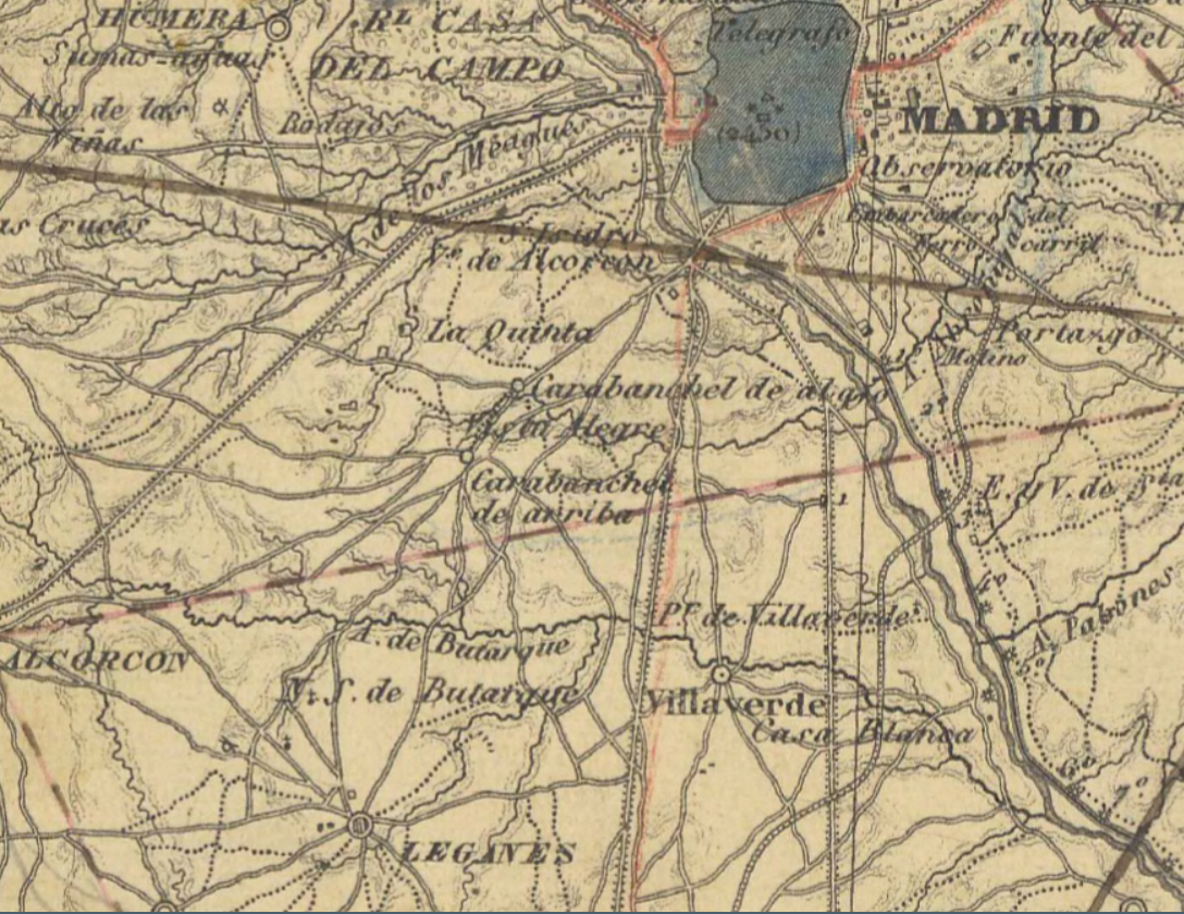 Mapa de 1853 donde se observa el límite entre los términos municipales de los Carabancheles