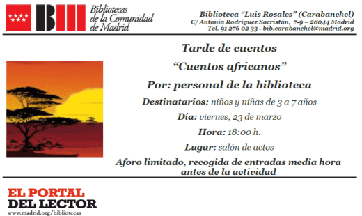 El viernes 23 de marzo a las 18 h habrá una tarde de cuentos «Cuentos africanos» en la biblioteca Luis Rosales (C/ Antonia Rodríguez Sacristán 7-9) realizado por personal de la biblioteca. Esta destinado a niños y niñas de 3 a 7 años.