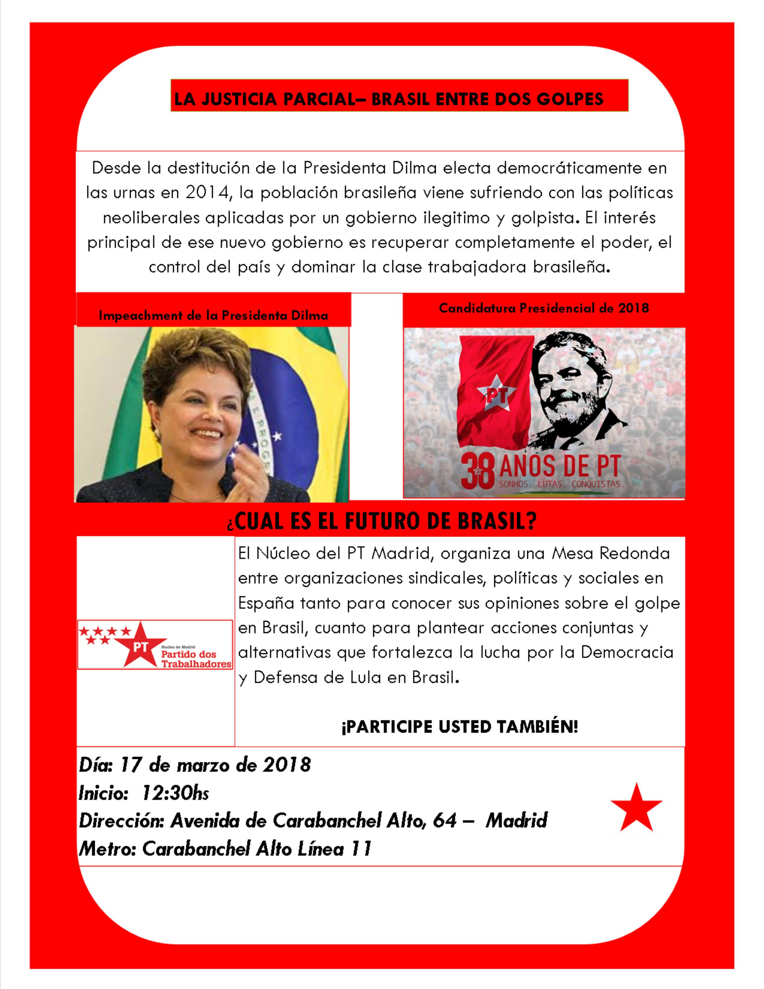Con la intervención de personas de distintas organizaciones sindicales, políticas y sociales en España se tratará la situación que vive actualmente la República de Brasil.