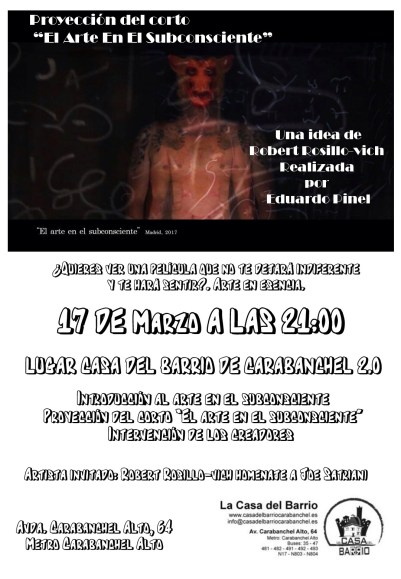 En «El arte en el subconsciente», un cortometraje a partir de una idea de Robert Rosillo-vich y realizado por Eduardo Pinel, se nos presenta una respuesta a ¿existe arte en nuestro subconsciente?. ¿Qué tipo de arte es?. En esta ocasión, se proyectará la película y sus creadores nos expondrán la idea, su realización, etc. Además, les acompañará Luís Sierra quién ha colaborado en la dirección y realización de la versión «¿Cómo se hizo?».