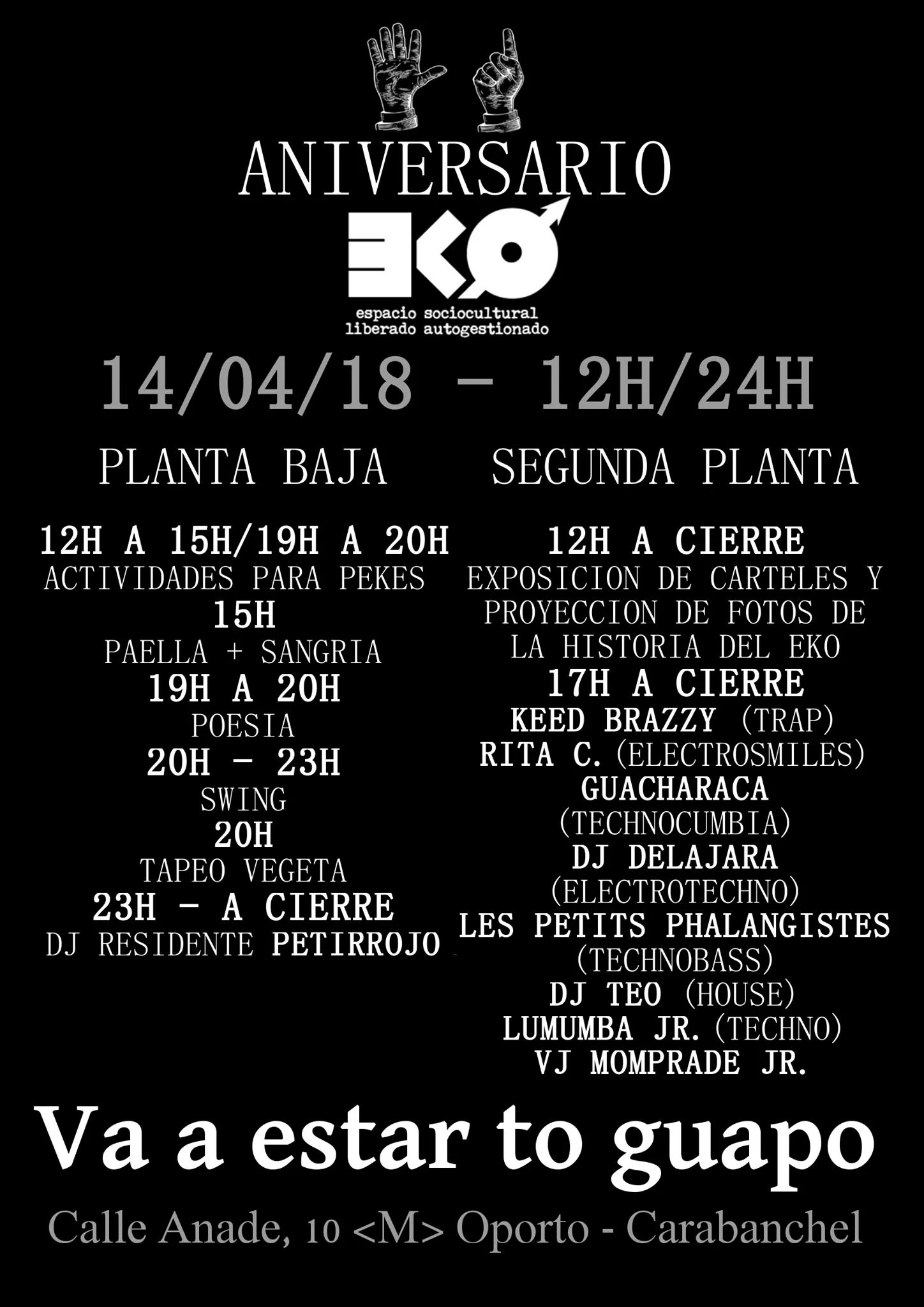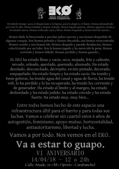El próximo sábado 14 de abril se celebra el sexto aniversario del EKO (C/ Ánade 10). Esta es la programación:
