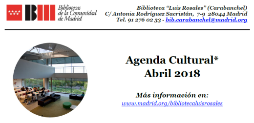 Consulta la agenda cultural de la biblioteca Luis Rosales (C/ Antonia Rodríguez Sacristán 7-9) que incluye conciertos, recitales, lecturas, talleres, exposiciones y proyecciones de películas aquí: