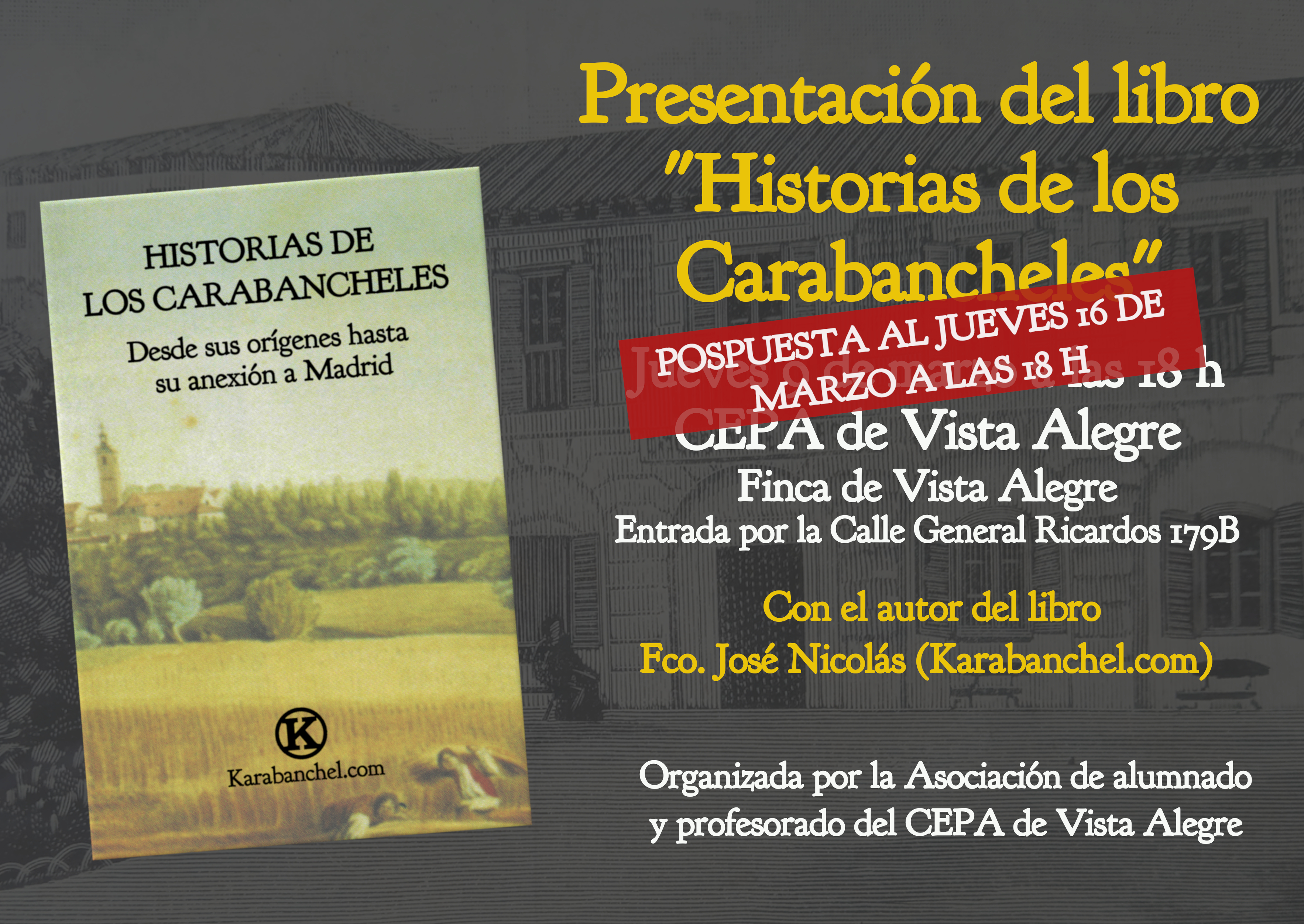 Por asuntos familiares nos vemos obligados a posponer la presentación de libro «Historias de los Carabancheles» que iba a celebrarse el 9 de marzo en el CEPA Vista Alegre al jueves 16 de marzo a las 18 h. Sentimos las molestias.